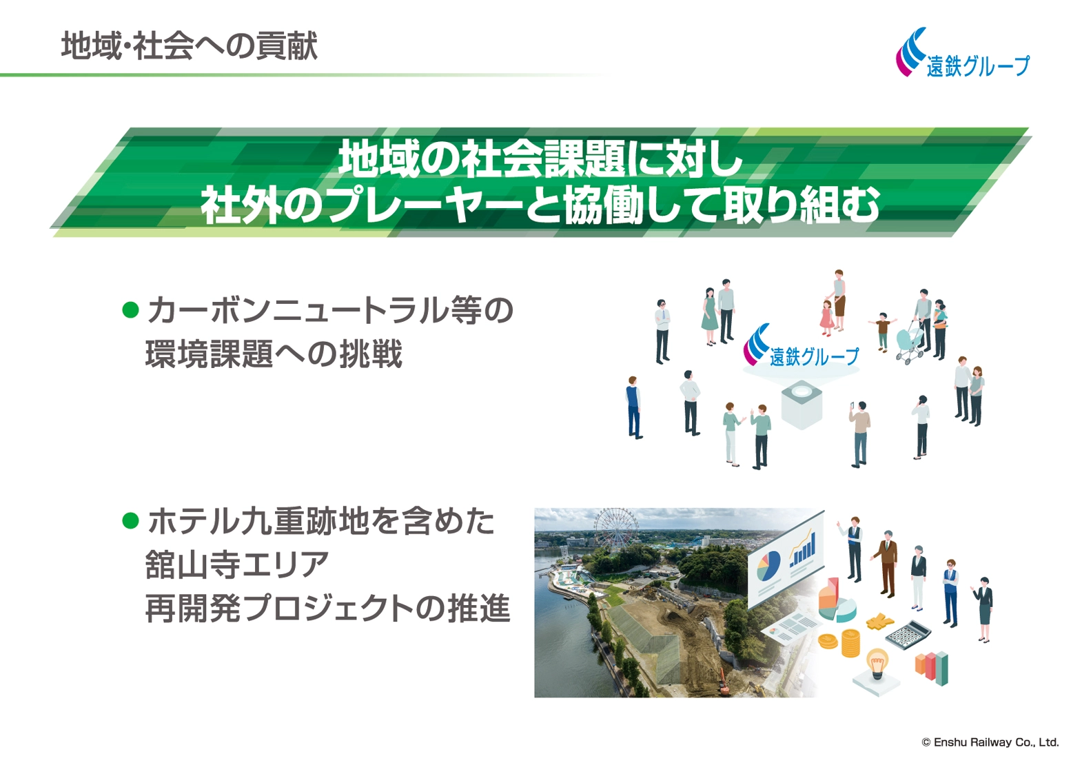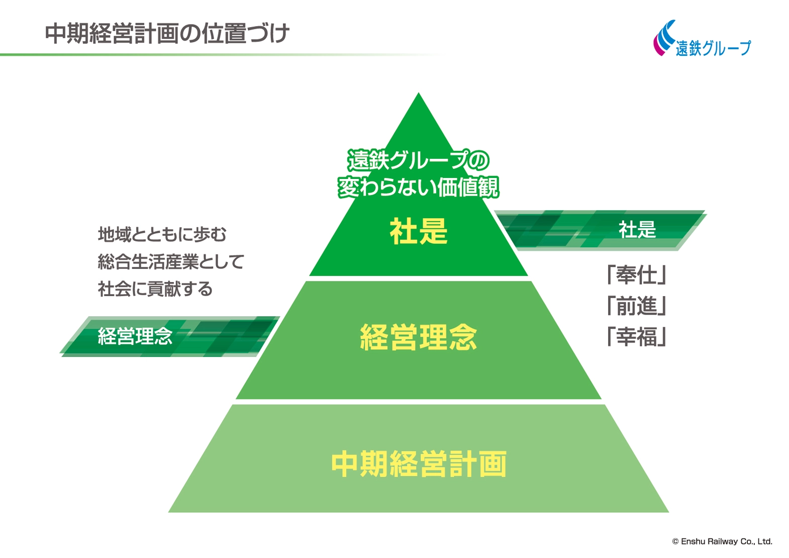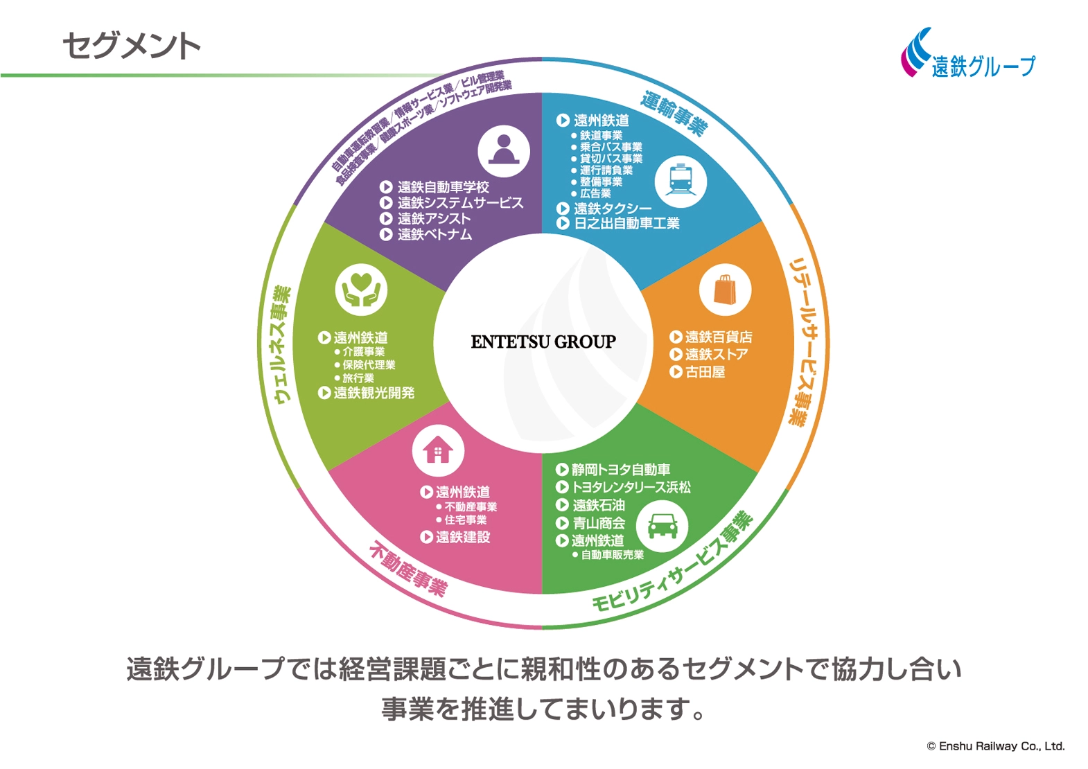 私たち遠州鉄道は、鉄道やバスなどの運輸事業を中心に培われてきた「信頼」を基に、不動産事業、保険代理業、介護事業などを営み成長してまいりました。さらにグループとしては多角経営を進め、地域の皆様の生活に密着した幅広い事業を展開するグループ事業体へと「地域とともに歩む総合生活産業として社会に貢献する」という経営理念のもと発展を遂げてまいりました。